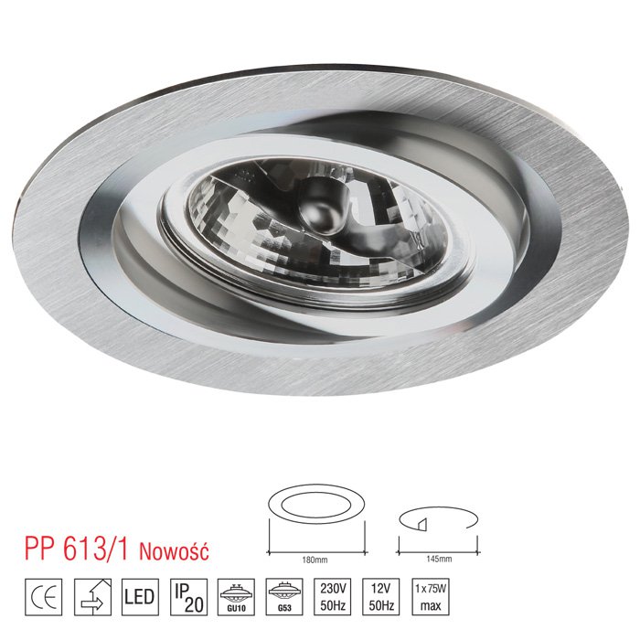 Oprawa halogenowa LM 613/1 to doskonała propozycja oświetlenia, które zostaje umieszczone w suficie, podbitce albo we wnęce ściany. Źródło światła LED opiera się na żarówce typu ES111, AR111 oraz QR111.