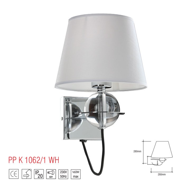Kinkiet LM 1062/1 WHITE to produkt z ekskluzywnej linii Premium, zaprojektowany przez Light&More. Produkt wysokiej jakości, wykonany z największą dbałością o szczegóły. Kinkiet wykonany jest z chromowanego metalu, białego materiału oraz przezroczystego szkła, dzięki czemu produkt idealnie komponuje się z każdym stylem aranżacyjnym, tym samym podkreślając i nadając niebanalnego charakteru.