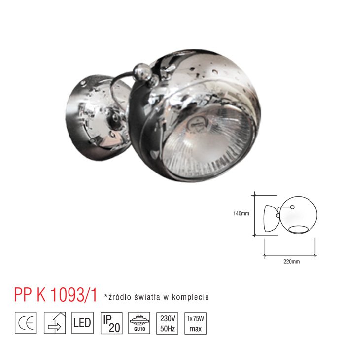 Kinkiet wykonany z chromowanego metalu. Możliwość regulacji w dwóch płaszczyznach. W komplecie żarówka ES111 75W (o wartości 57 zł) z wymiennym wkładem G9!