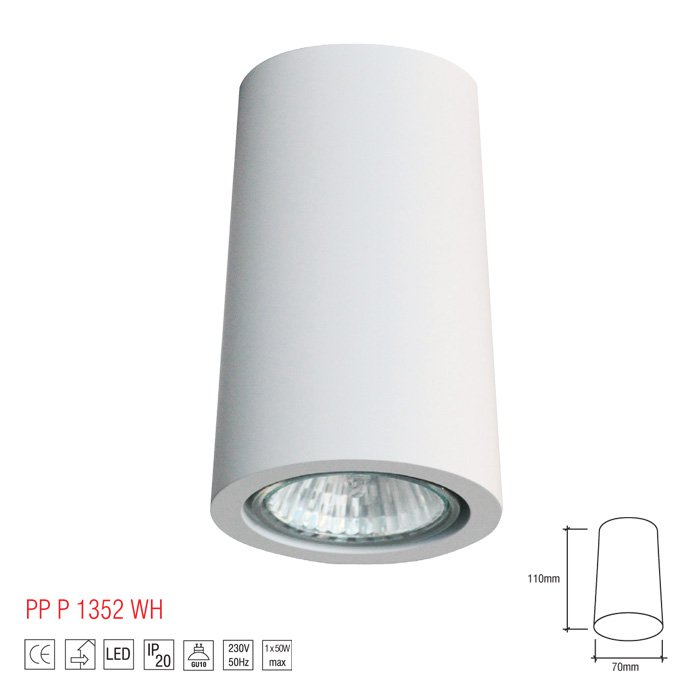 Plafon - oprawa natynkowa o kształcie stożka wykonana z aluminium lakierowanego na kolor biały.