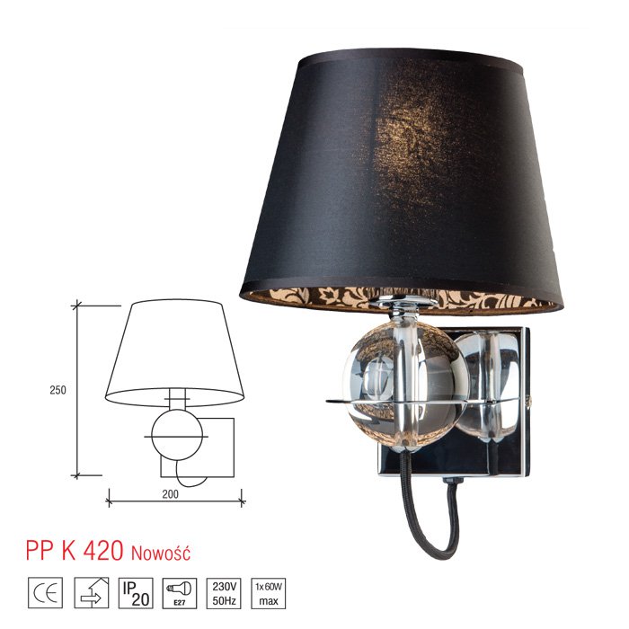 Kinkiet LM K 420/1 BLACK to produkt z ekskluzywnej linii Premium, zaprojektowany przez Light&More. Produkt wysokiej jakości, wykonany z największą dbałością o szczegóły. Kinkiet wykonany jest z chromowanego metalu, czarnego materiału oraz przezroczystego szkła, dzięki czemu produkt idealnie komponuje się z każdym stylem aranżacyjnym, tym samym podkreślając i nadając niebanalnego charakteru.